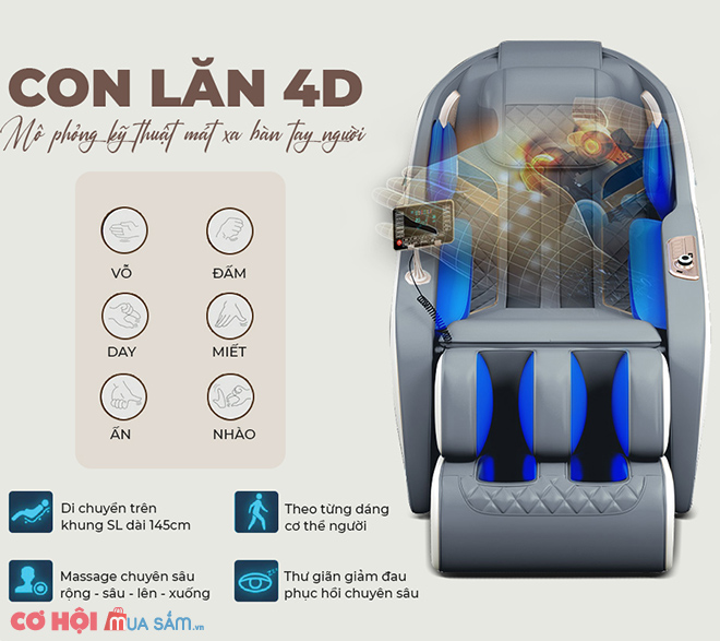 Hệ thống con lăn massage 4D được bọc silicon dẻo cao cấp, cho người dùng cảm giác thật như bàn tay con người đang thực hiện. Con lăn chuyển động linh hoạt, đa chiều theo các hướng trái phải, lên xuống, ra vào, xoay và ấn tại chỗ. Mô phỏng các kỹ thuật đấm, vỗ, miết, day, ấn, nhào, nặn…