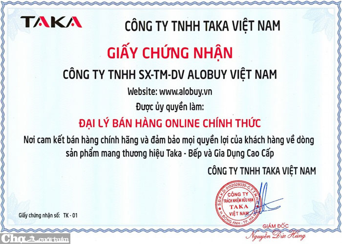 Bằng giấy chứng nhận này, Công ty TNHH Taka Việt Nam chứng nhận cho Công ty TNHH SX-TM-DV ALOBUY Việt Nam quyền đại lý phân phối online các sản phẩm thiết bị nhà bếp cao cấp thương hiệu Taka tại Việt Nam.