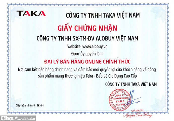 Chứng nhận đại lý phân phối bán hàng thiết bị nhà bếp cao cấp Taka